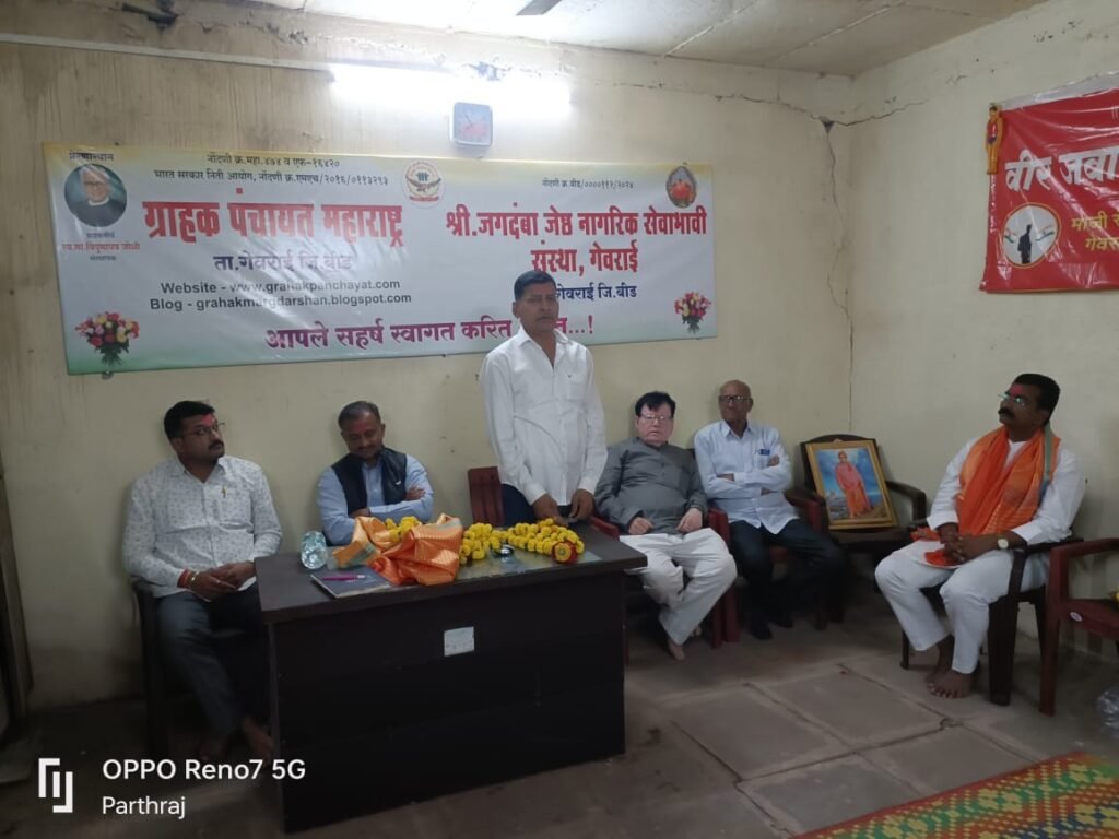 गेवराई शहरातील नगर परिषदेतील ज्येष्ठ नागरिक विरंगुळा केंद्र येथे श्री जगदंबा ज्येष्ठ नागरिक सेवाभावी संस्था गेवराई व ग्राहक पंचायत महाराष्ट्र यांच्या संयुक्त विद्यमाने सत्काराचे आयोजन करण्यात आले होते .याप्रसंगी सर्वप्रथम श्री जगदंबा जेष्ठ नागरिक सेवा भावी संस्थेचे अध्यक्ष अनिल बोर्डे यांनी संस्थेच्या कार्याची व ग्राहक पंचायत महाराष्ट्र यांनी केलेल्या कार्याची माहिती उपस्थितांसमोर सादर करण्यात आली. ज्येष्ठ नागरिक या संस्थेच्या वतीने पुरस्कार प्राप्त, गुणवंत विद्यार्थी सत्कार, विविध वाढदिवस, अधिकाऱ्या चे सत्कार, ग्राहक पंचायत महाराष्ट्र यांच्या वतीने ग्राहक जागृती करणे व विविध समस्या सोडविण्यात ग्राहक पंचायत यांना यश प्राप्त झाले आहे अशी माहिती अनिल बोर्डे यांनी समस्याचे निवेदन नगरपरिषद यांना दिले आहे उपस्थितता समोर दिली.